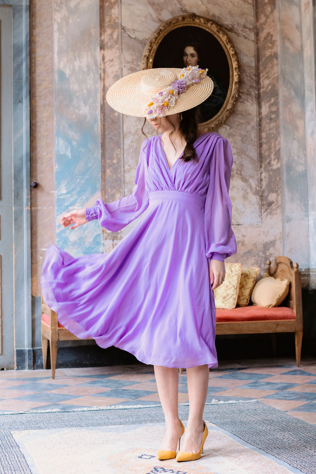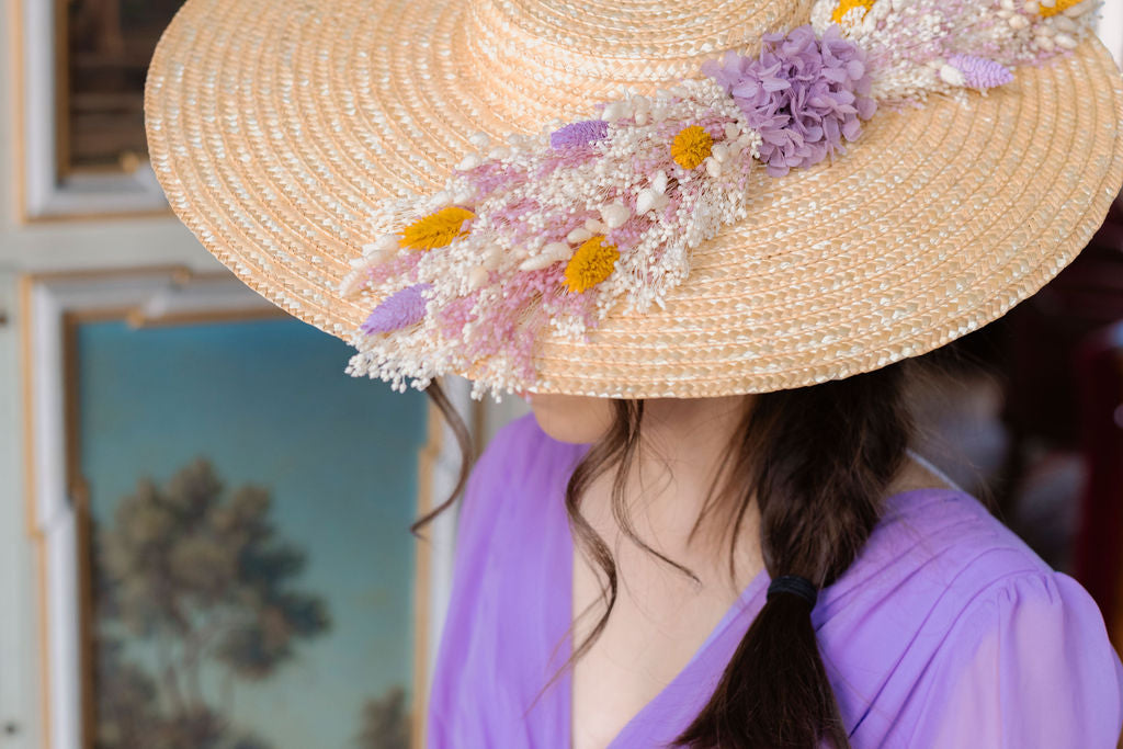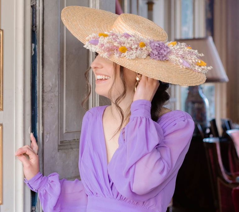 Cette capeline est composée de fleurs aux douces couleurs de lilas, jaune moutarde et blanc.