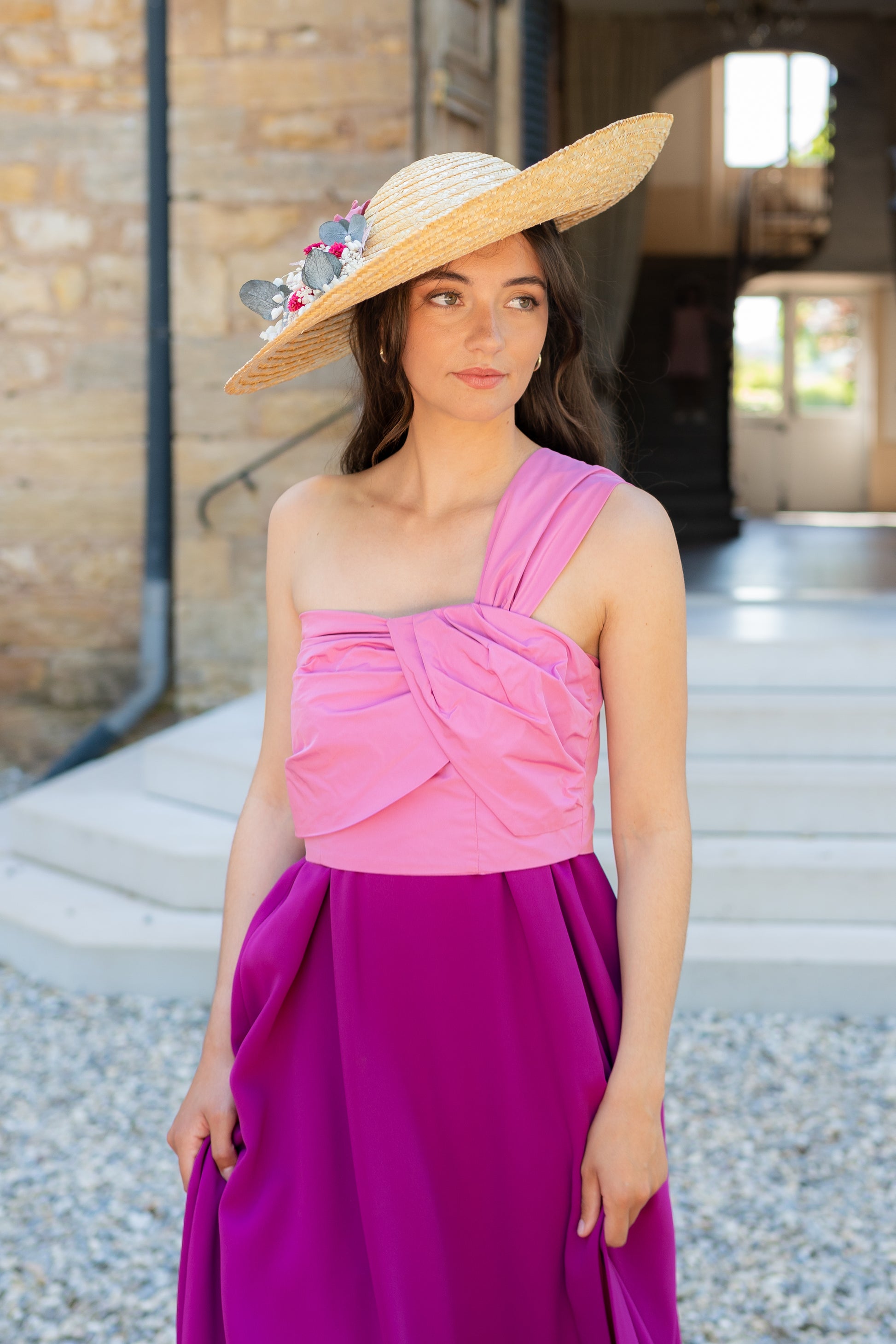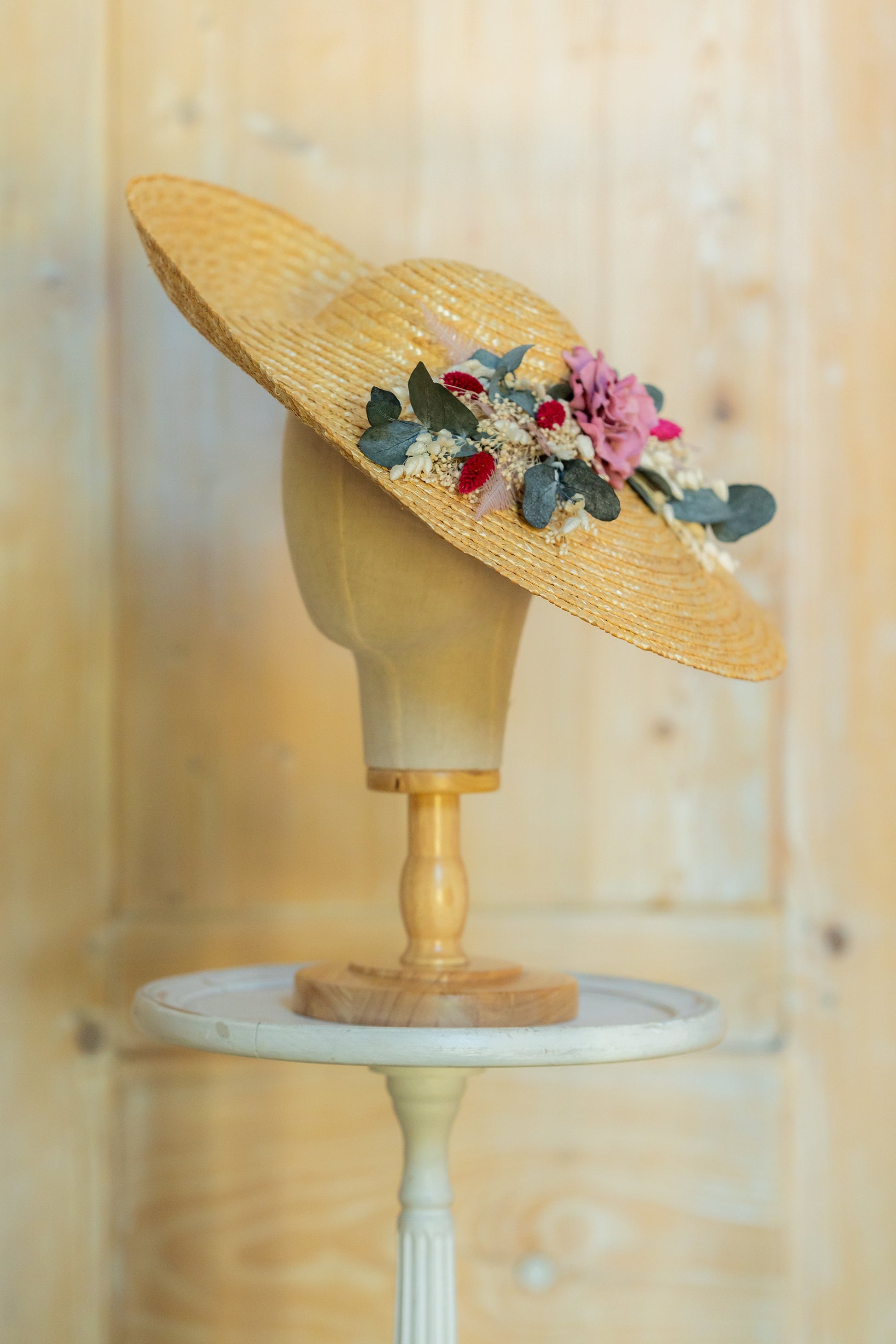 Alliant fleurs roses et blanches ponctuées d’un délicat feuillage, la capeline Olivia apporte une note subtile de couleur et d’élégance