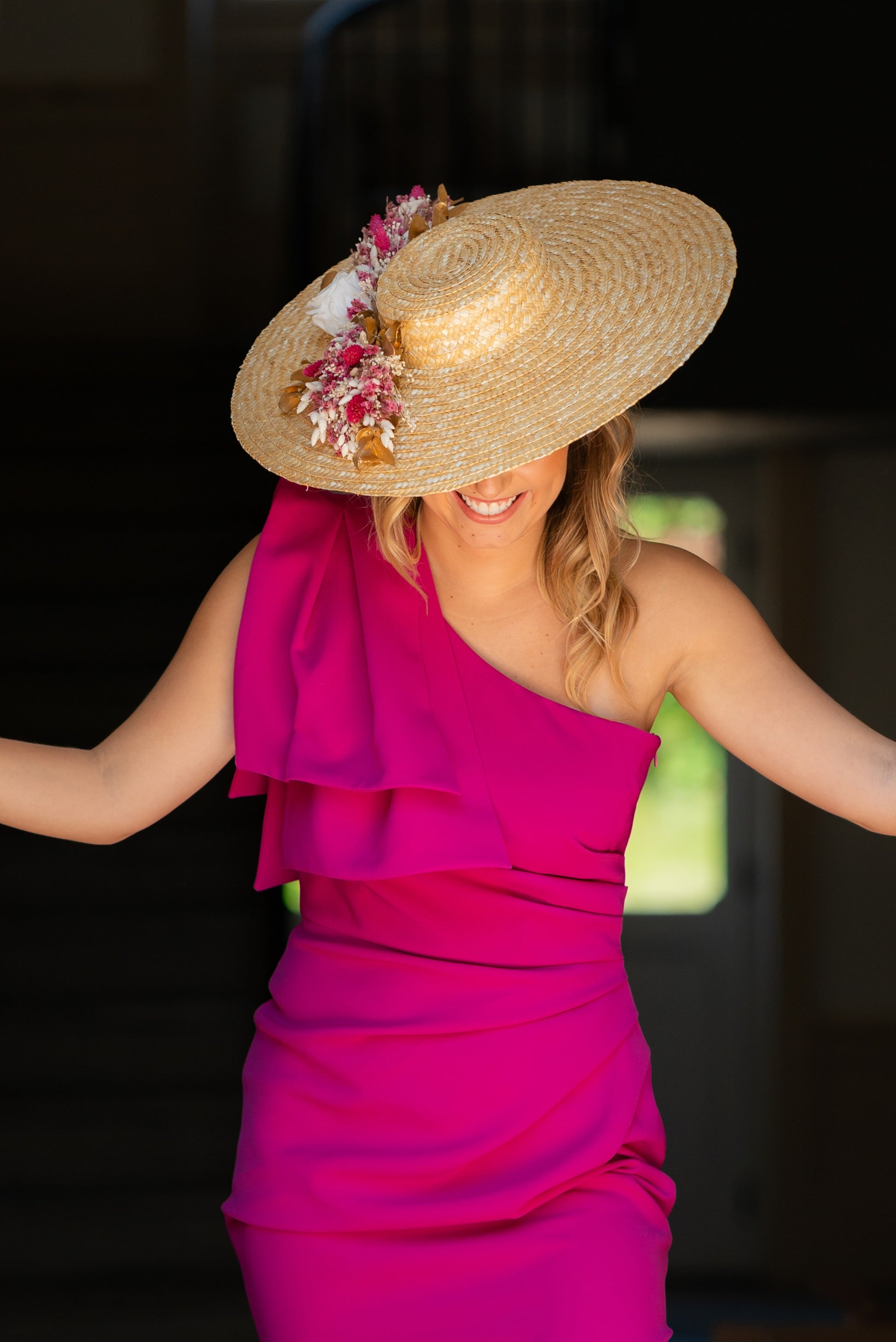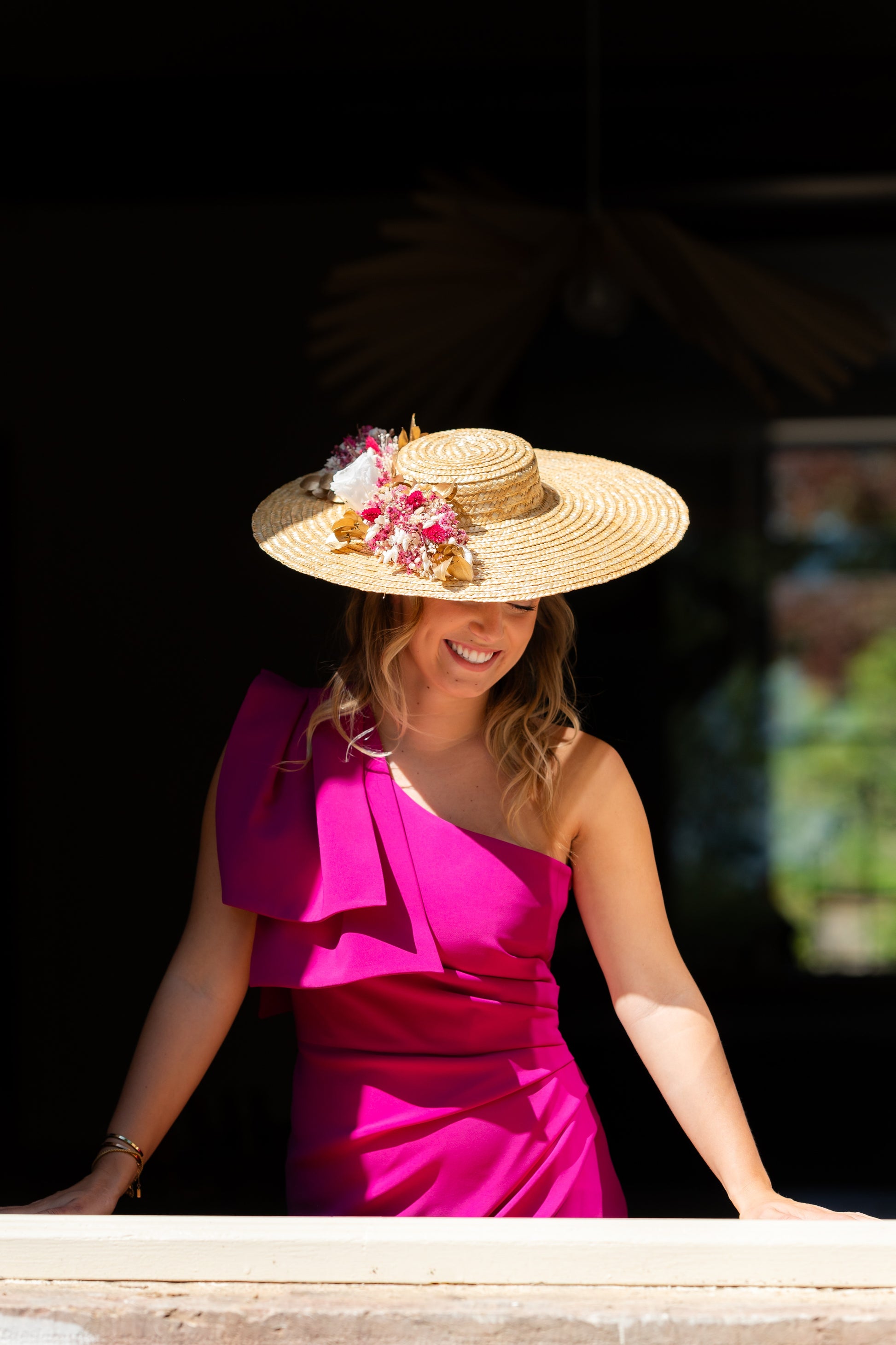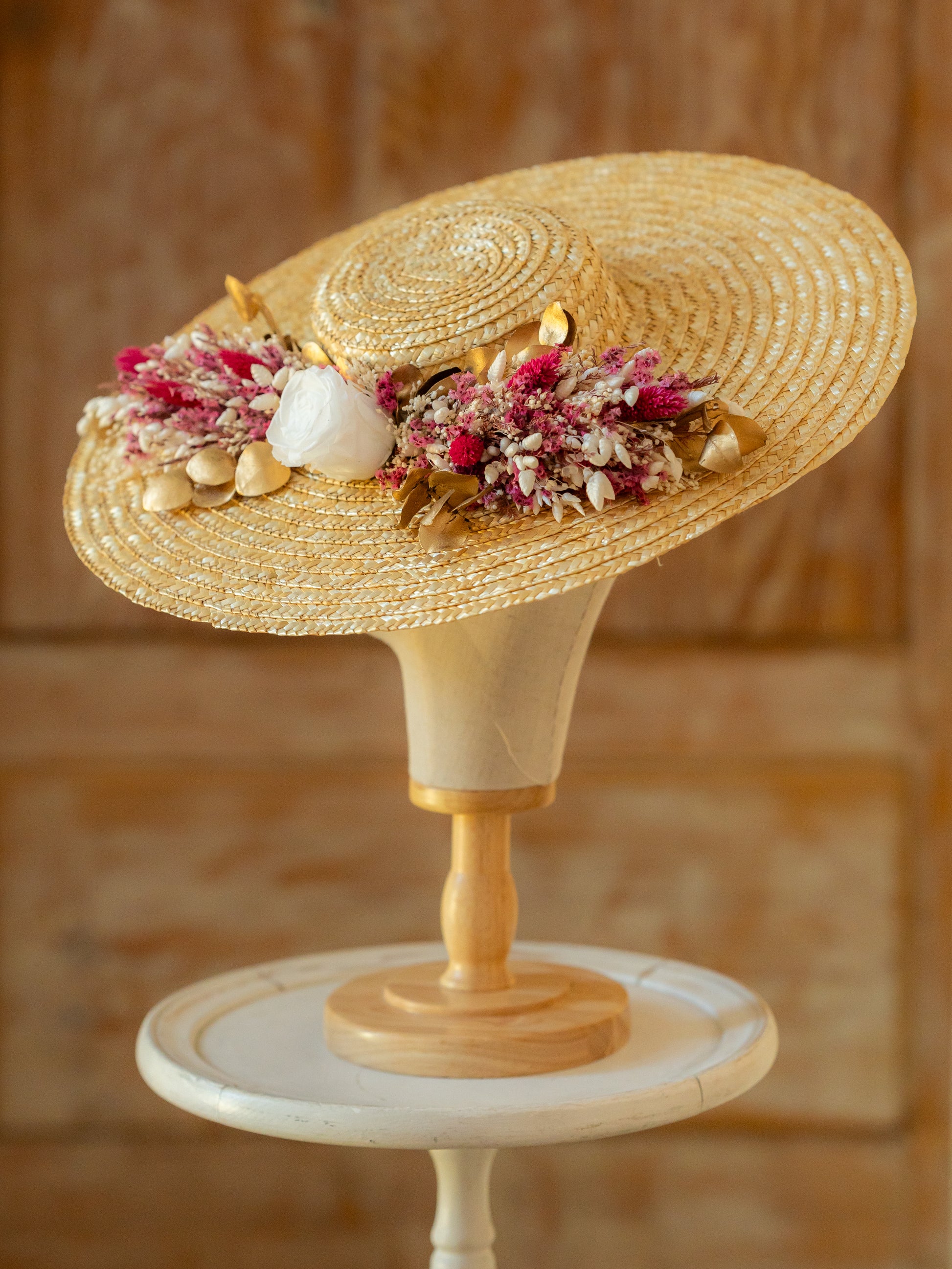 Délicatement ornée d’un camaïeu de fleurs dans les tons blanc, fuchsia et rose, rehaussée d’une rose blanche et de touches dorées pour une allure raffinée.