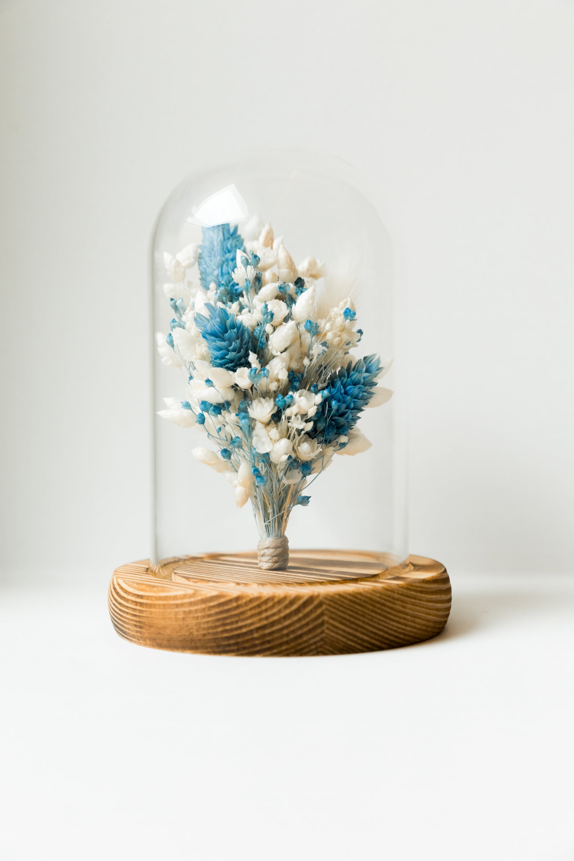 Sous sa cloche en verre et son socle en bois, cette délicate composition de fleurs séchées et stabilisées mêle des tons de bleu et de blanc.