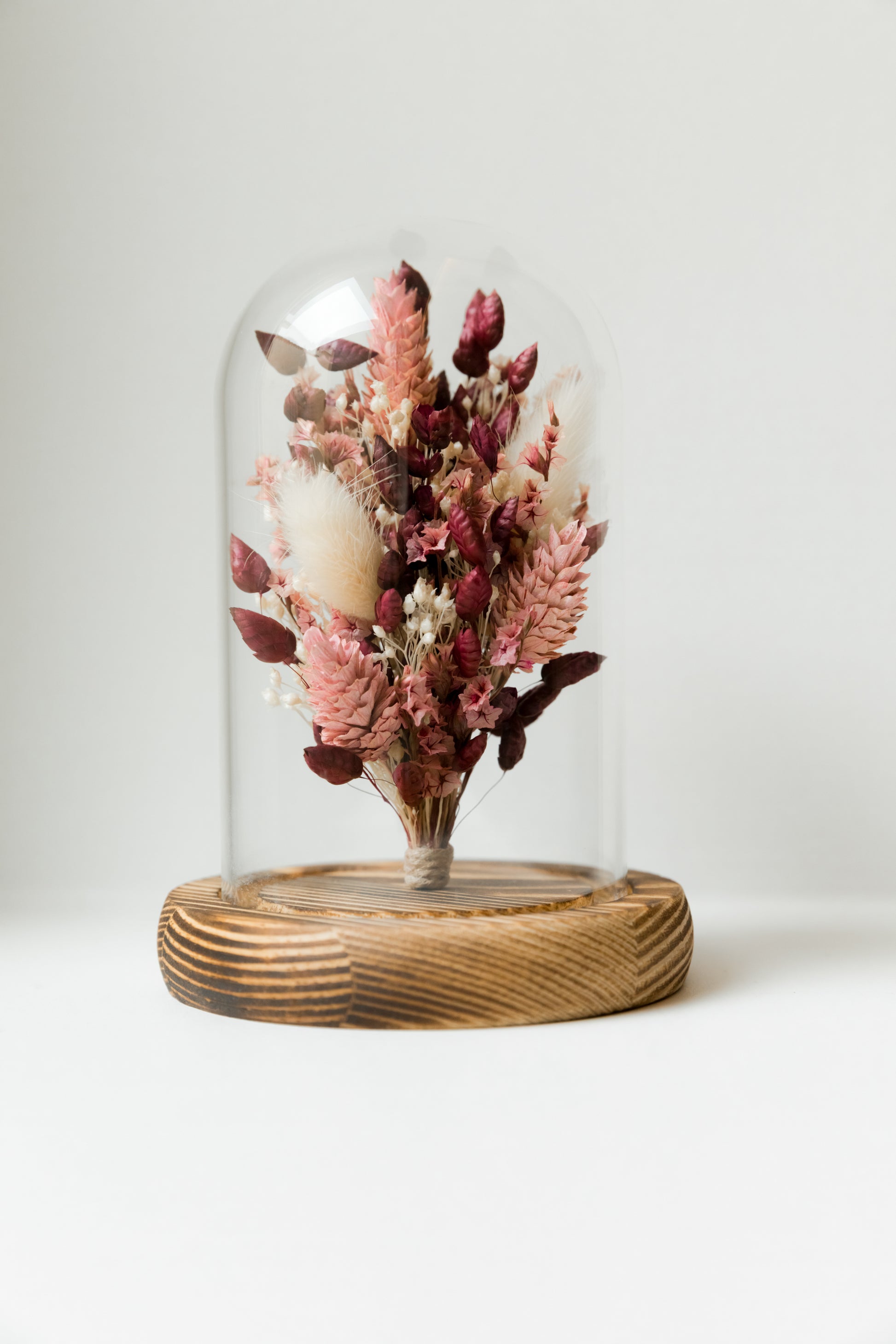 Sous sa cloche élégante en verre et bois, cette composition mêle des fleurs séchées et stabilisées aux teintes rose, bordeaux et blanc.