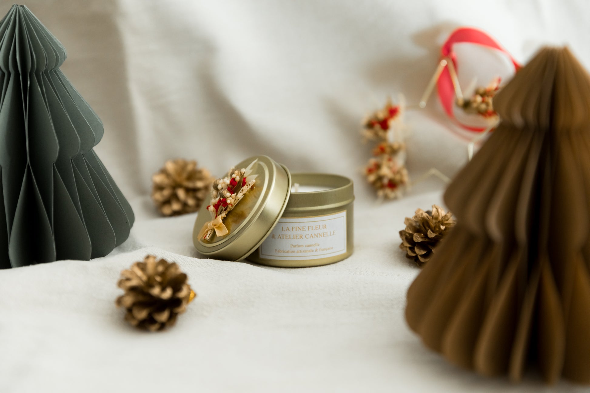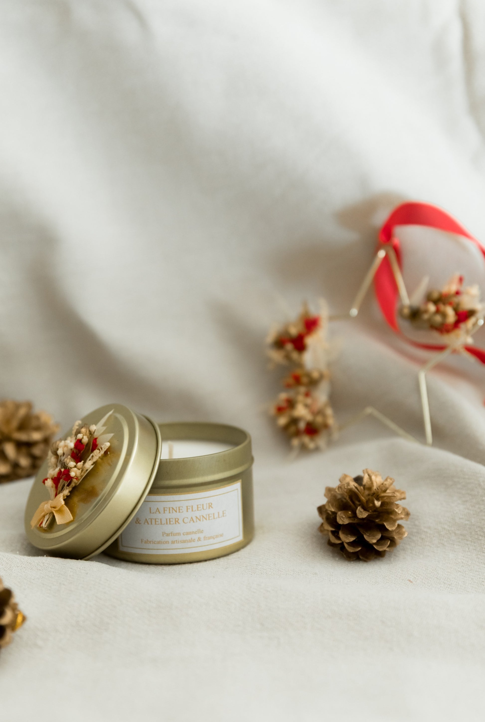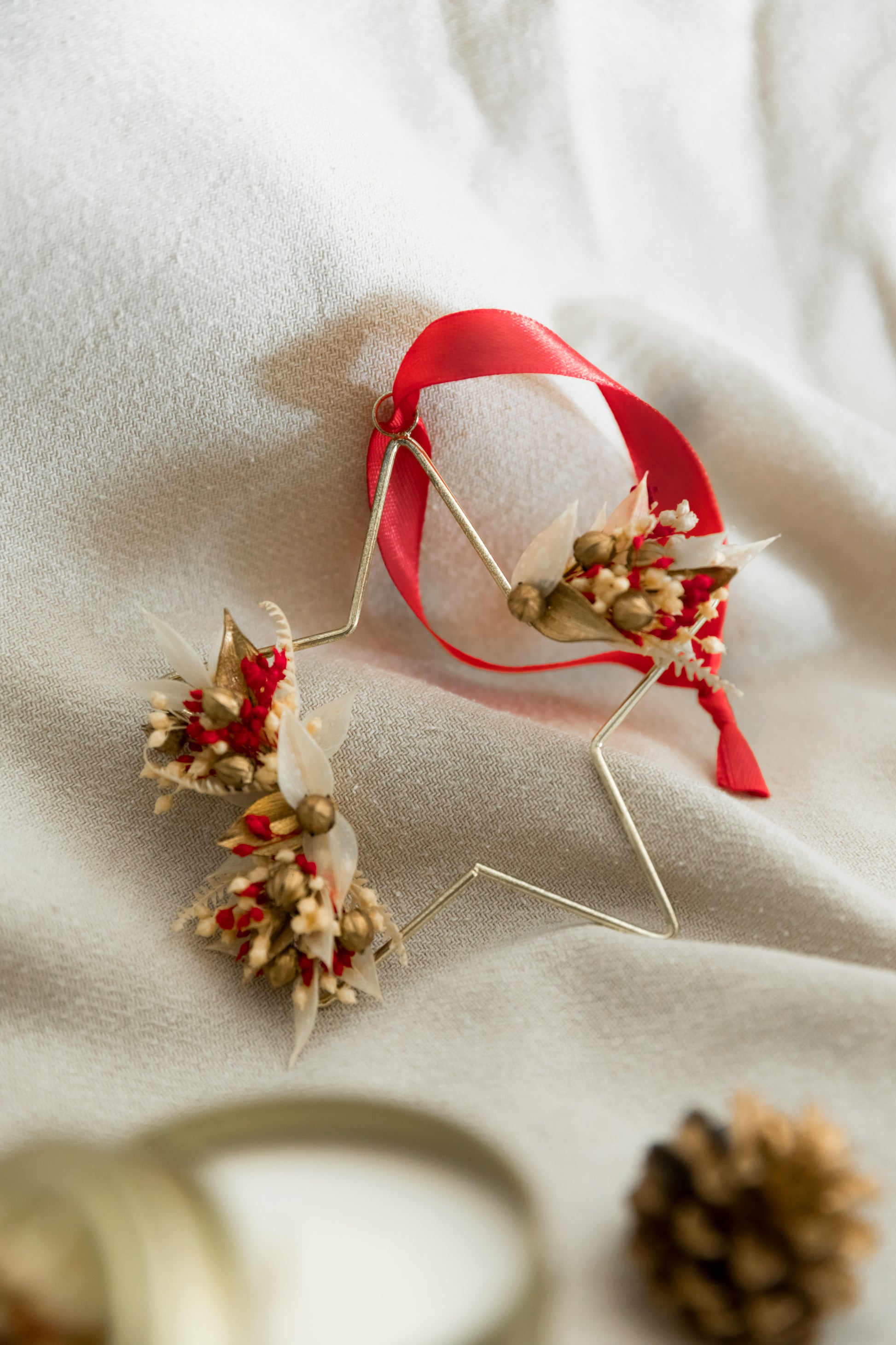 Cet ensemble se compose d'une bougie artisanale parfumée à la cannelle et d'une étoile décorée de fleurs séchées et stabilisées, dans de jolis tons chauds de rouge, doré et blanc.