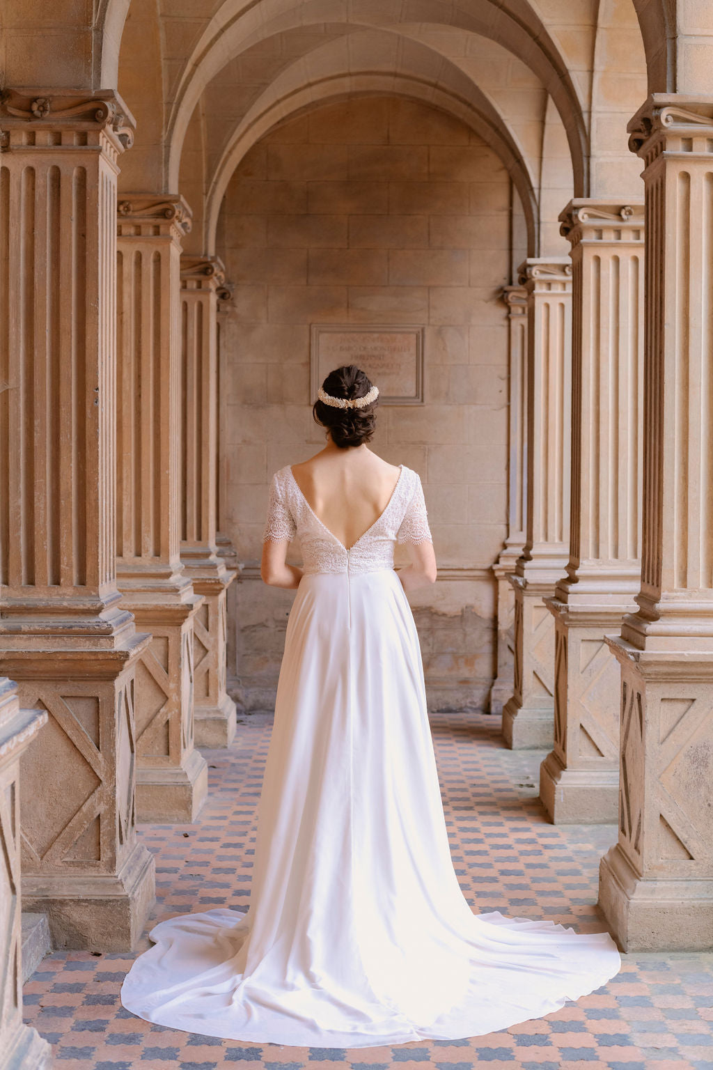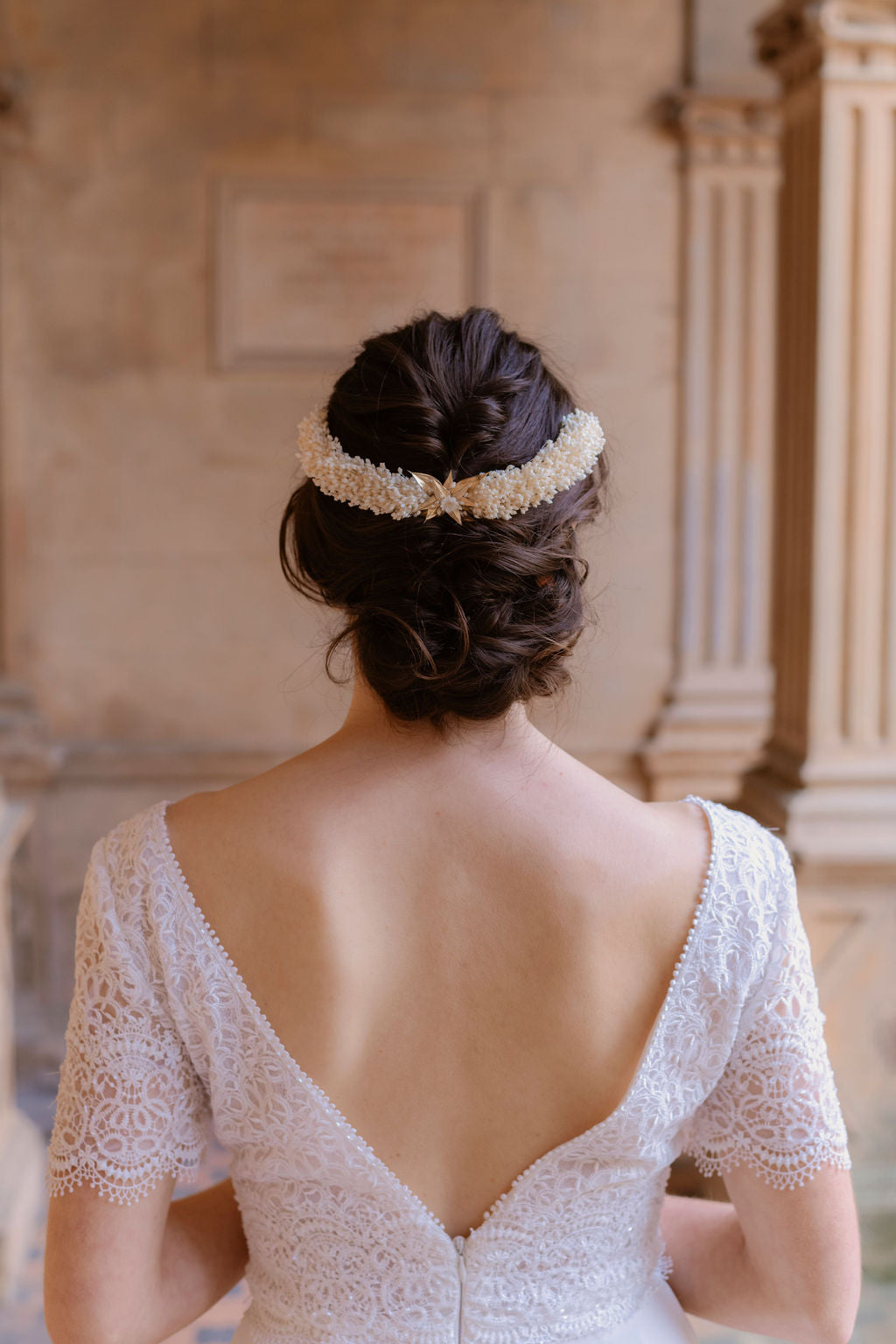 Composé de fleurs blanches et de touches dorées, il a été imaginé pour sublimer les mariées avec raffinement.