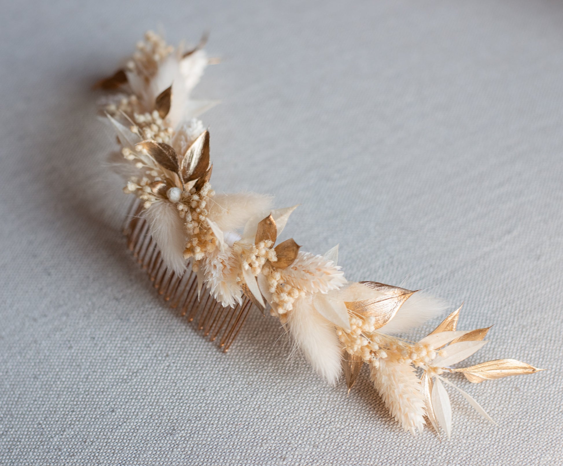 Ce peigne délicat mêle fleurs blanches et feuillage doré pour un rendu à la fois lumineux et sophistiqué.