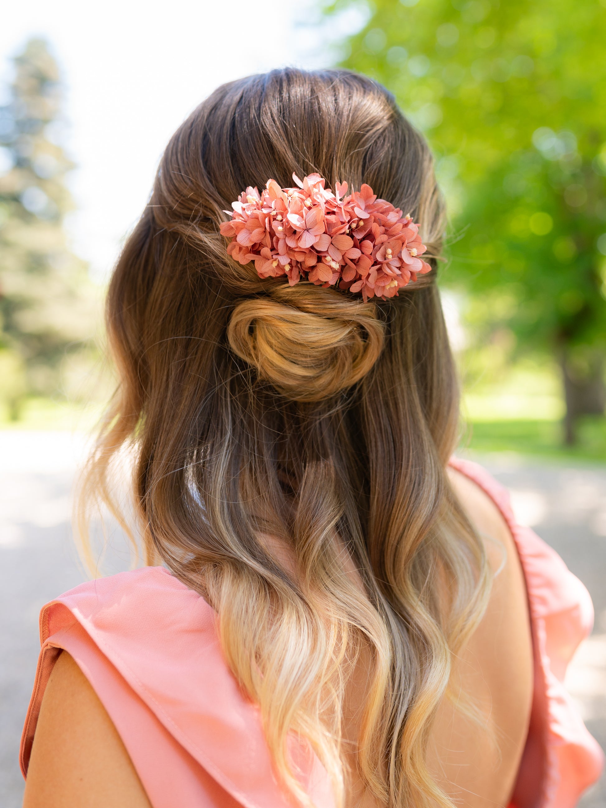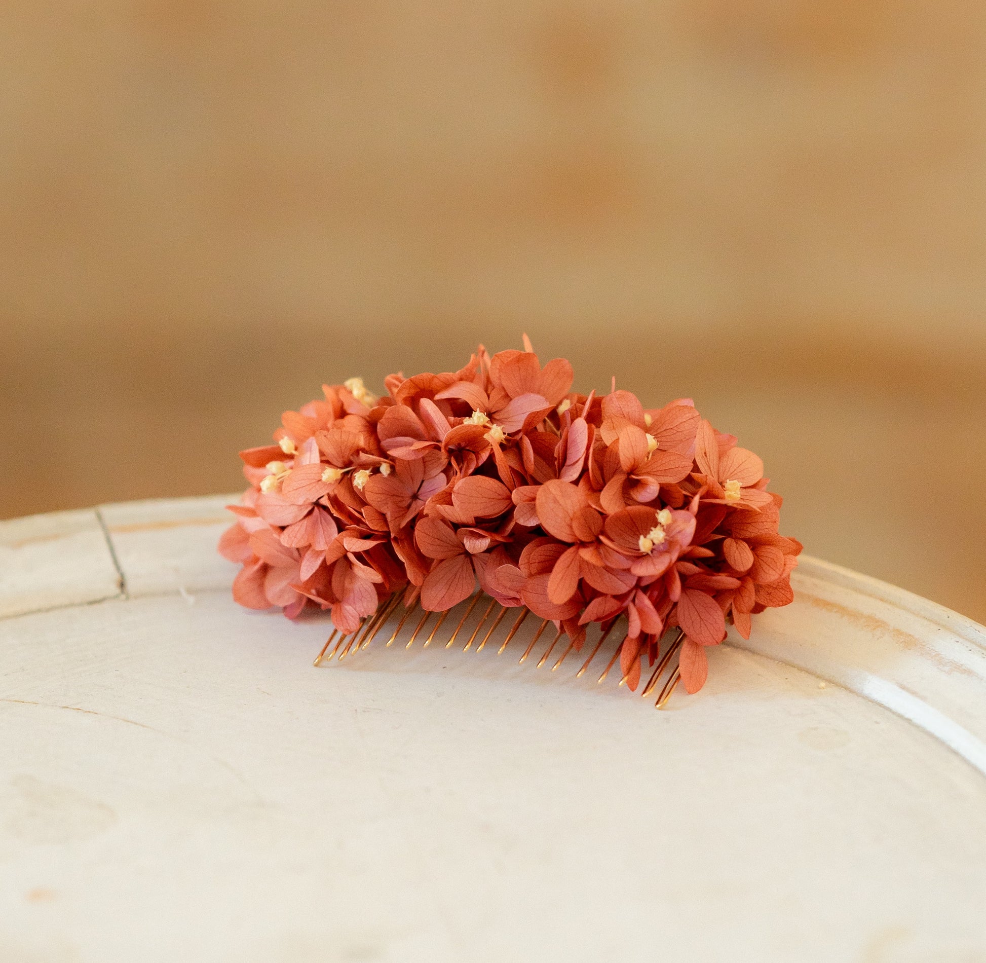Composé d’hortensias stabilisées dans des nuances profondes de vieux rose et blanc, ce peigne apporte une touche de caractère chaleureuse et solaire.
