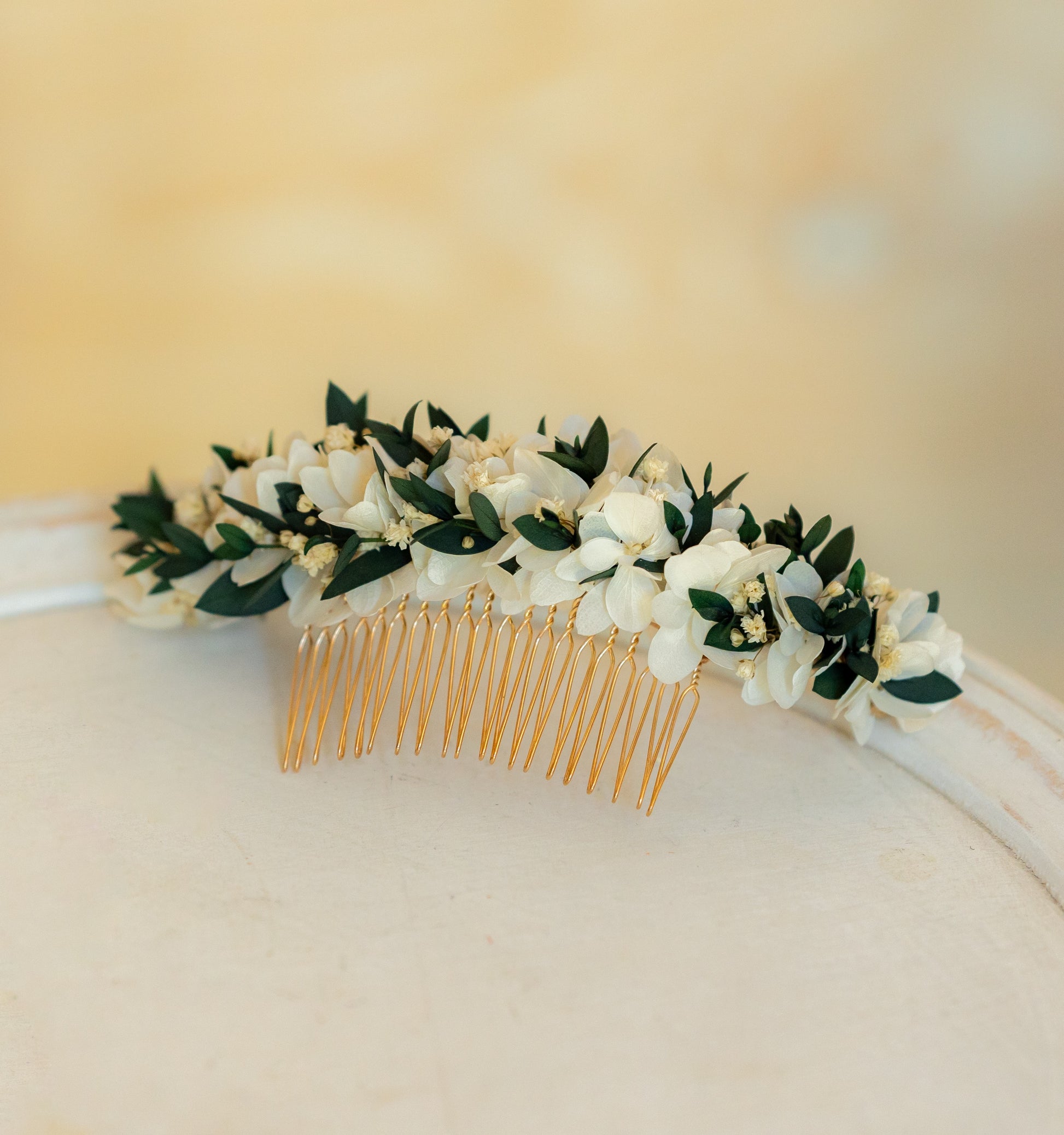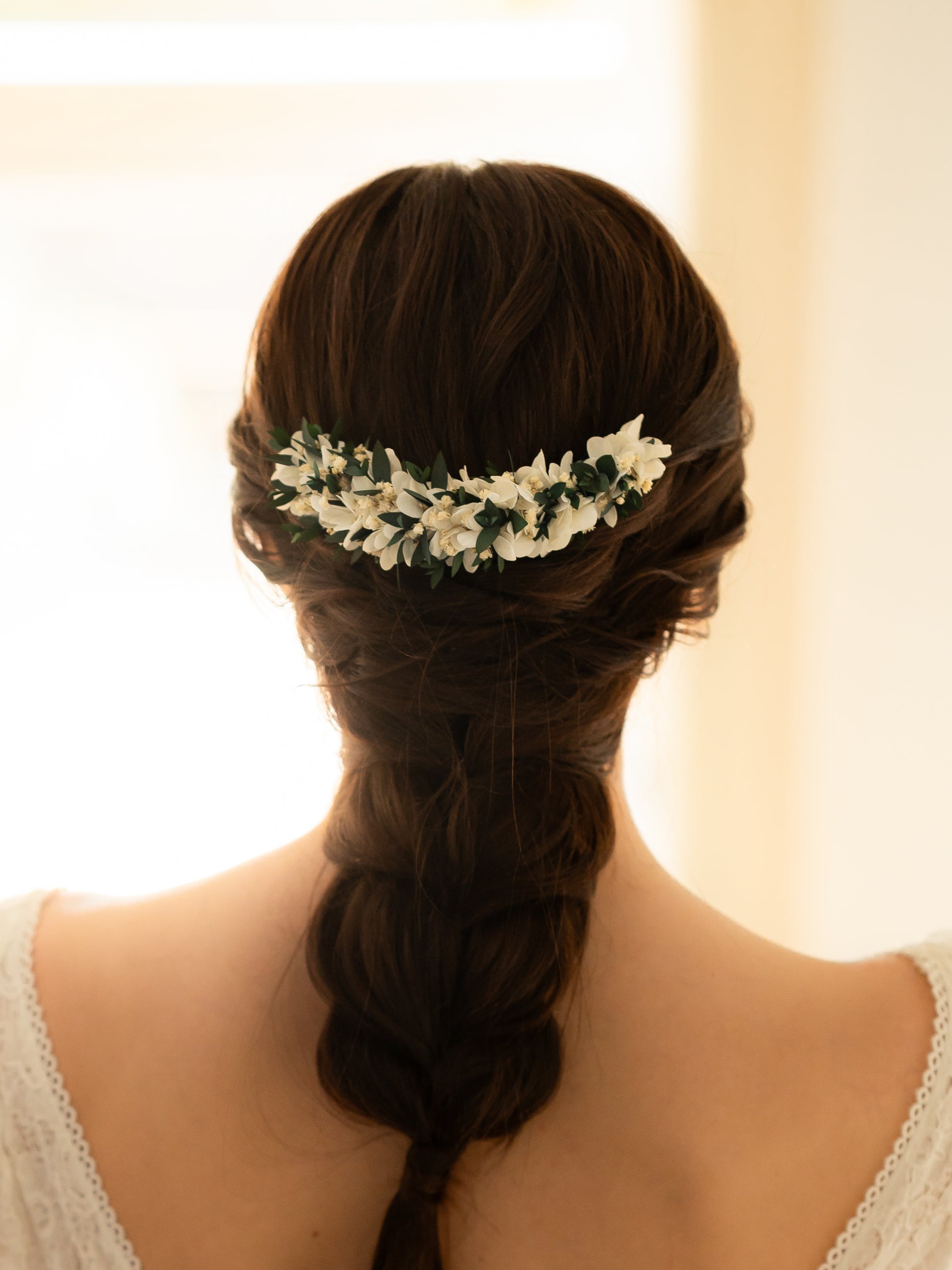 Ce peigne est composé de fleurs blanches et de feuillage, offrant un contraste raffiné et une allure fraîche et intemporelle.