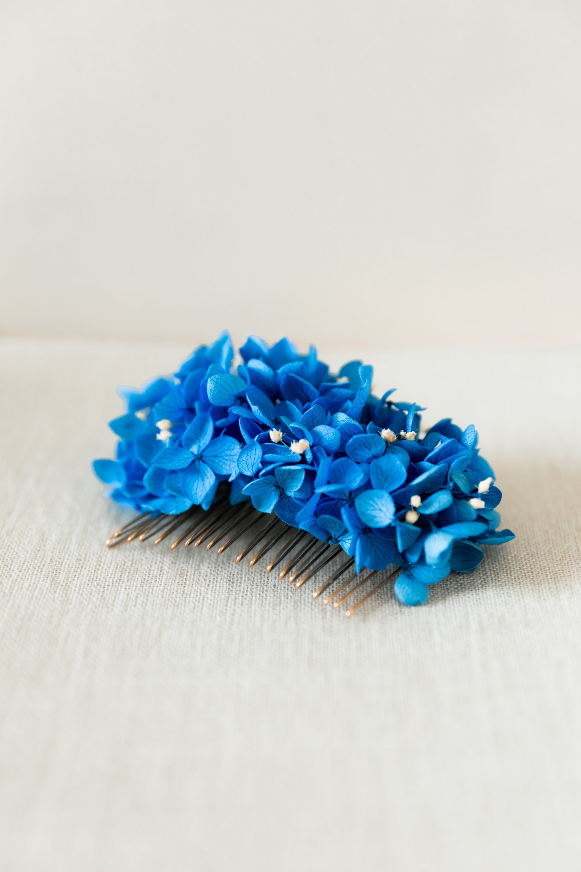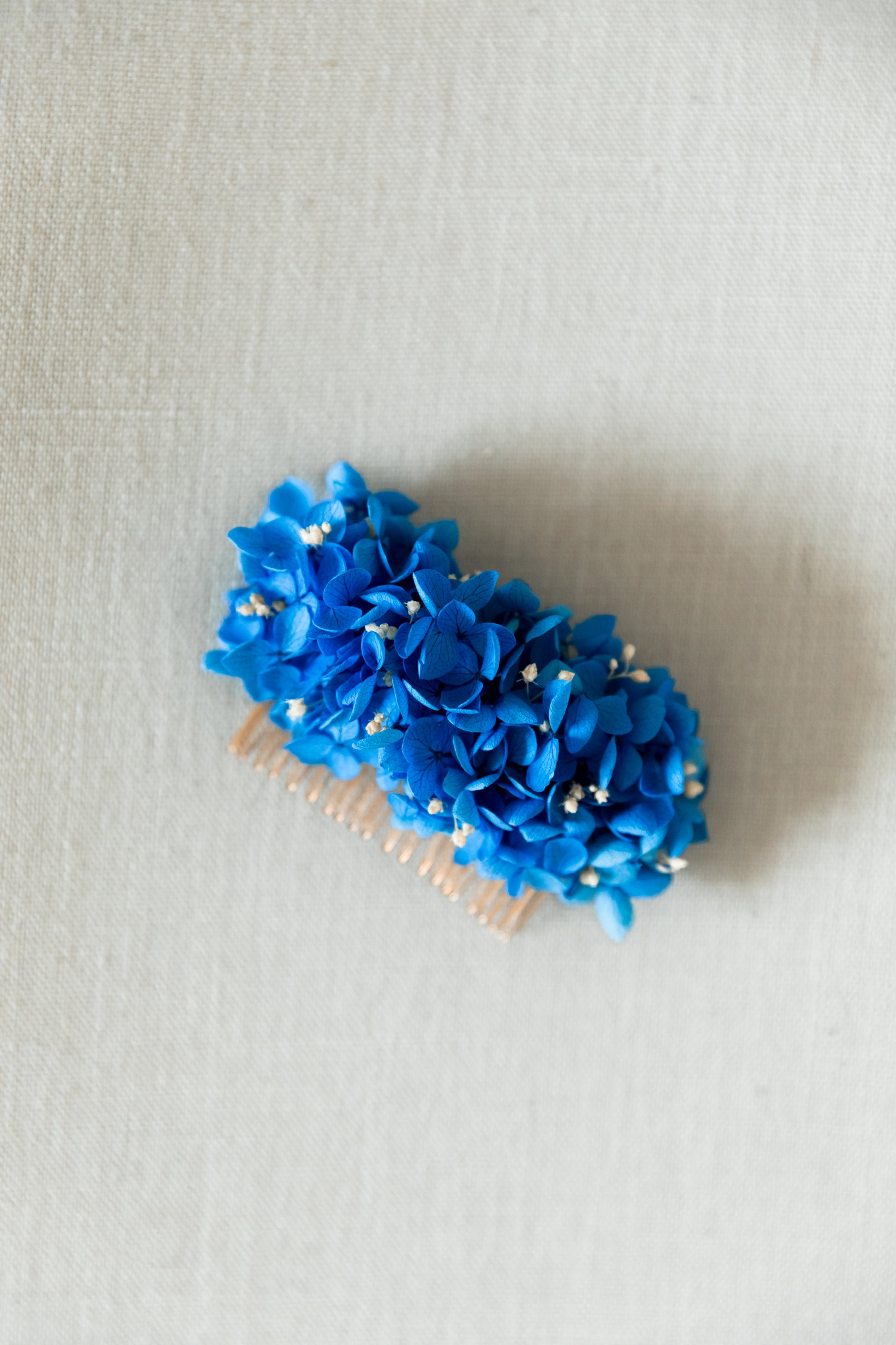 Composé d’hortensias stabilisés bleus et de touches de blanc, ce peigne apporte une note de caractère.