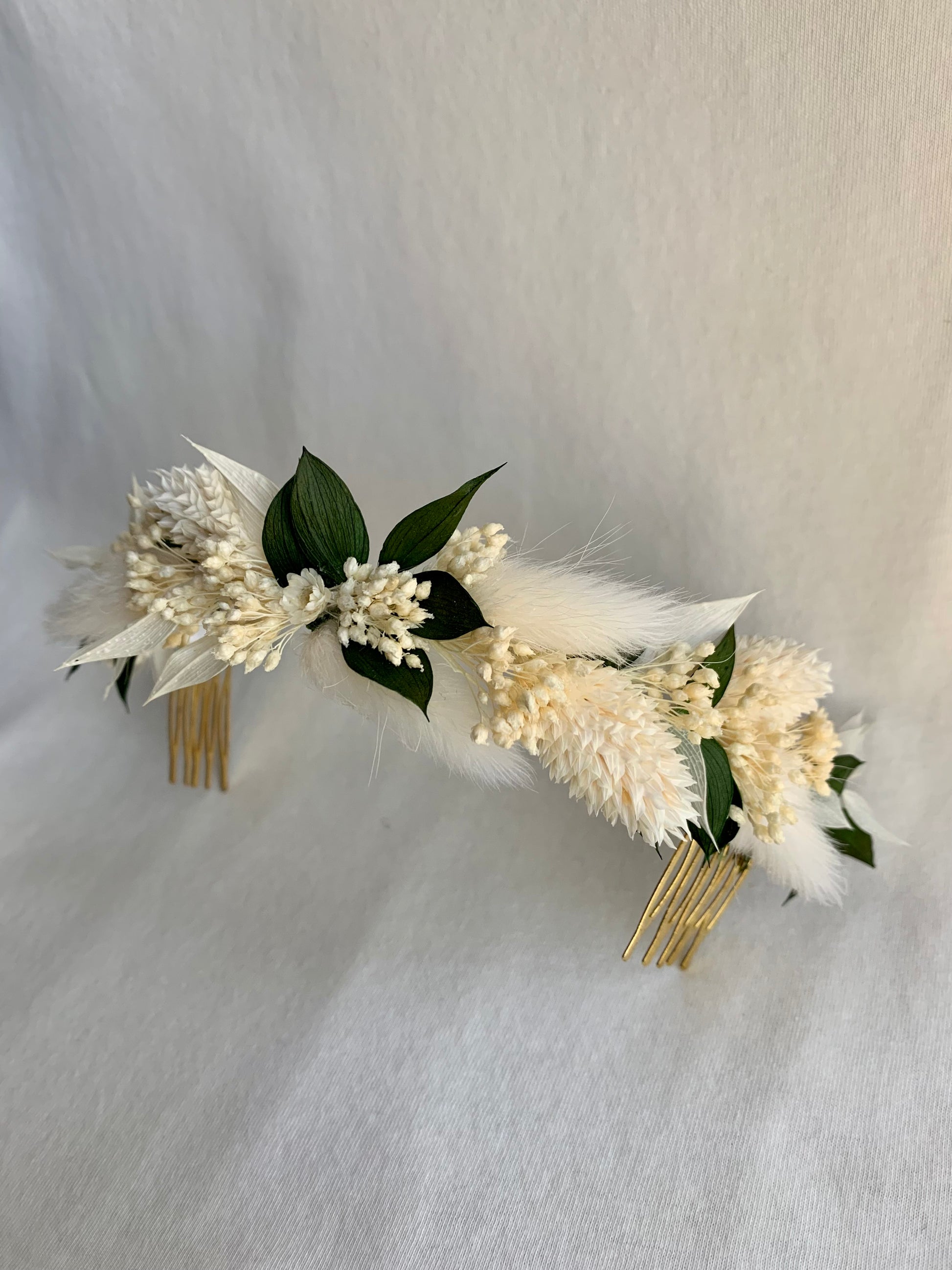 Le double peigne est l'accessoire parfait pour celles qui souhaitent un joli bijou de tête en fleurs séchées et stabilisées, se portant à l'arrière des cheveux.
