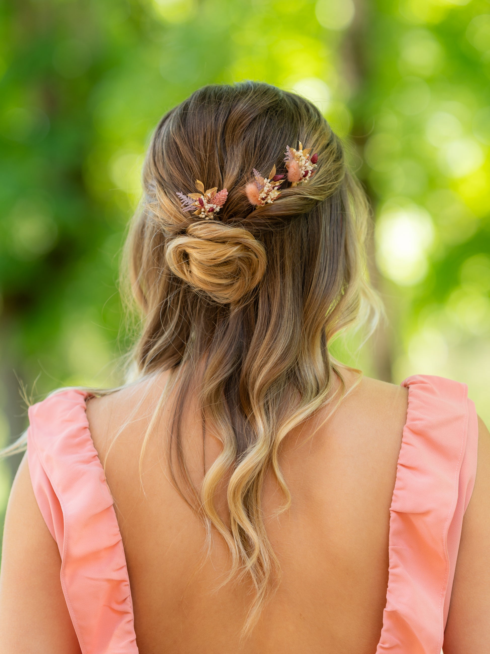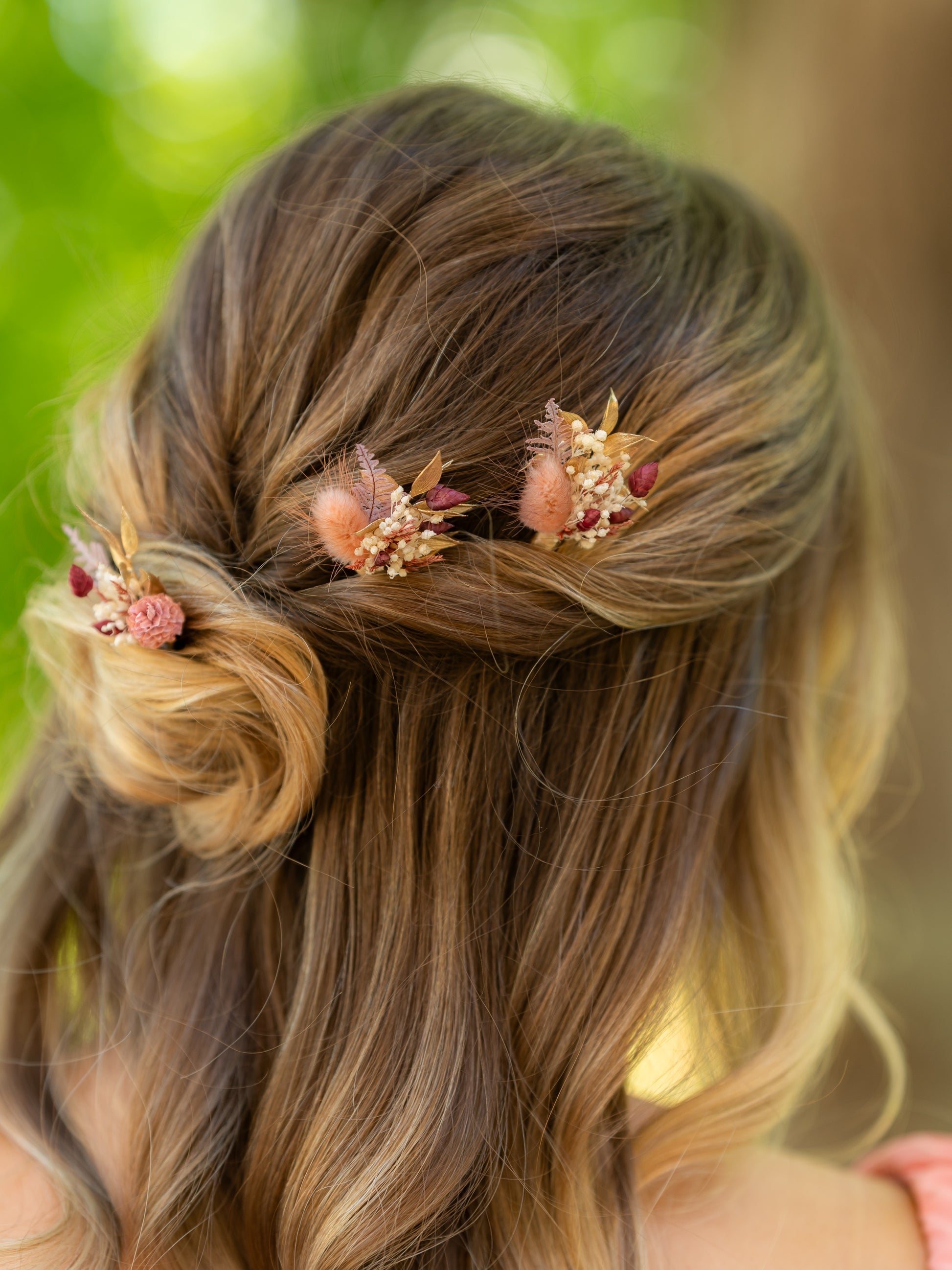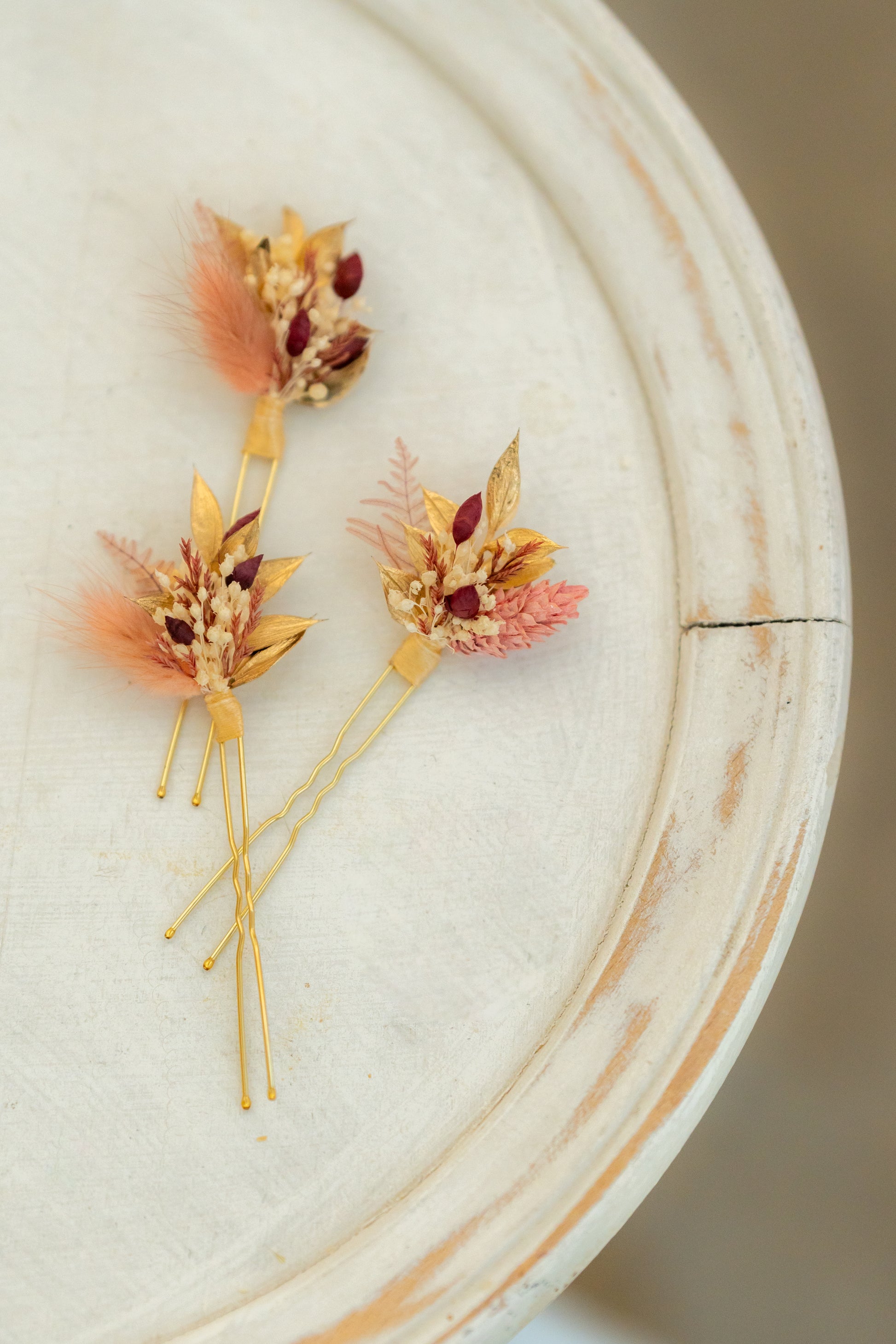 Ces pics à cheveux délicats apportent une touche florale et chaleureuse à votre coiffure, mêlant des teintes de blanc, vieux rose, bordeaux et or pour une harmonie douce et romantique.