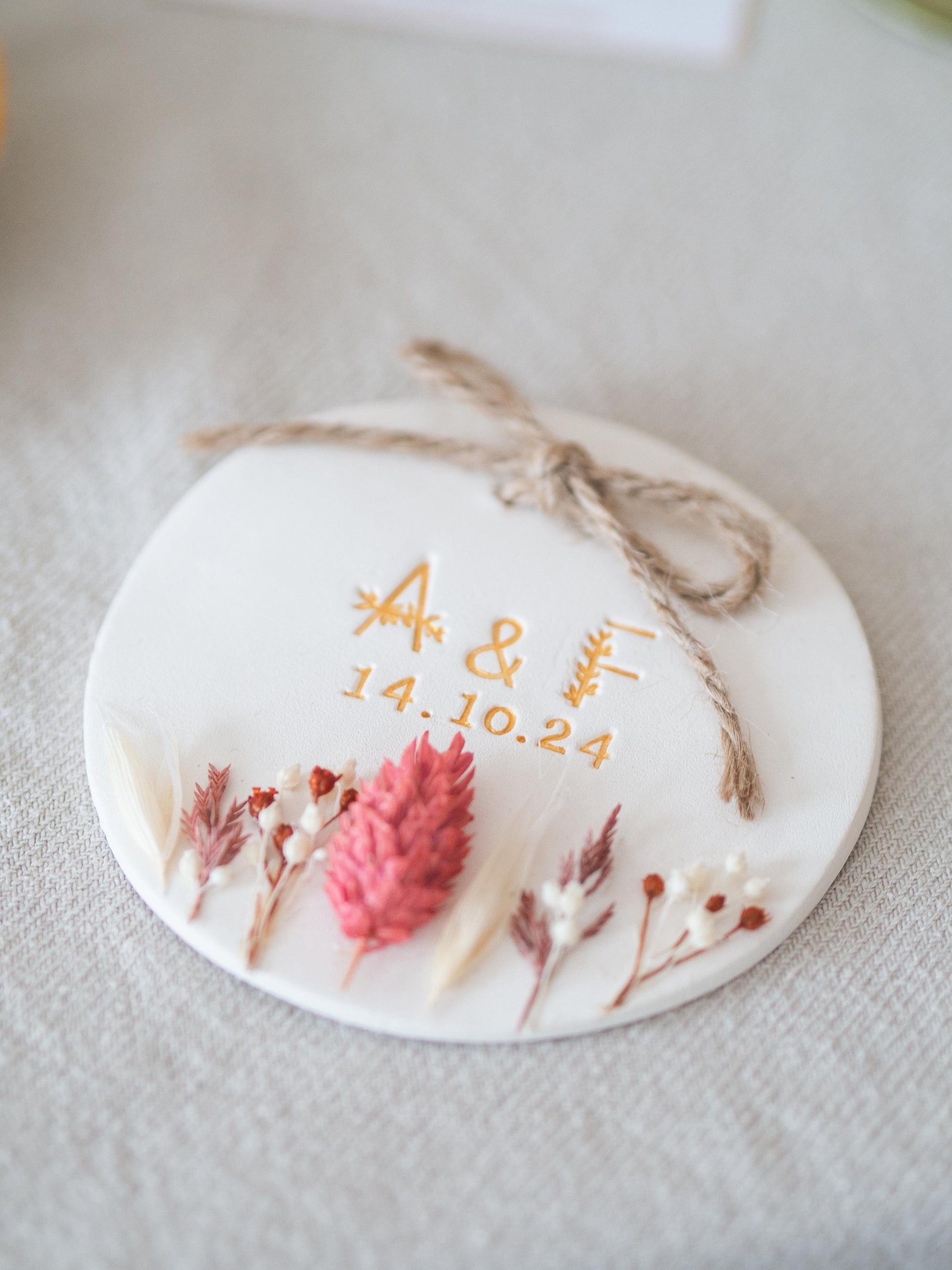Ce médaillon est une création entièrement personnalisée, aussi bien par le choix des couleurs des fleurs séchées et stabilisées que par l’inscription gravée dessus.