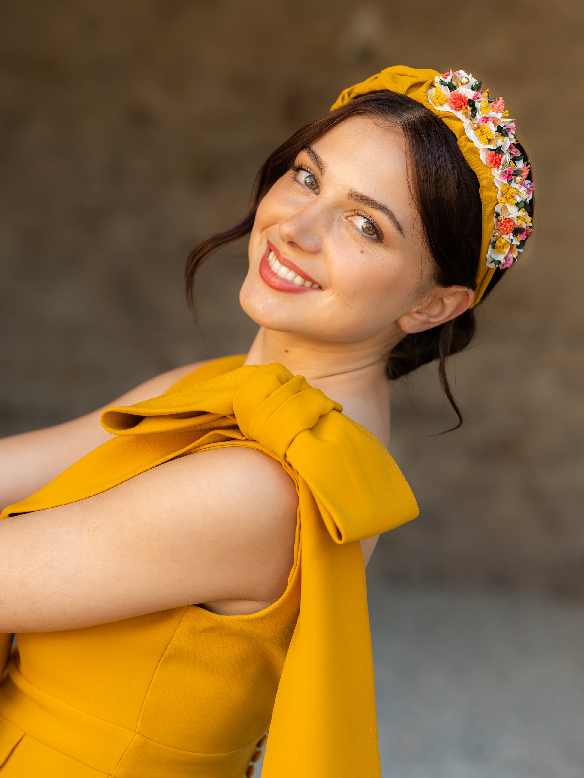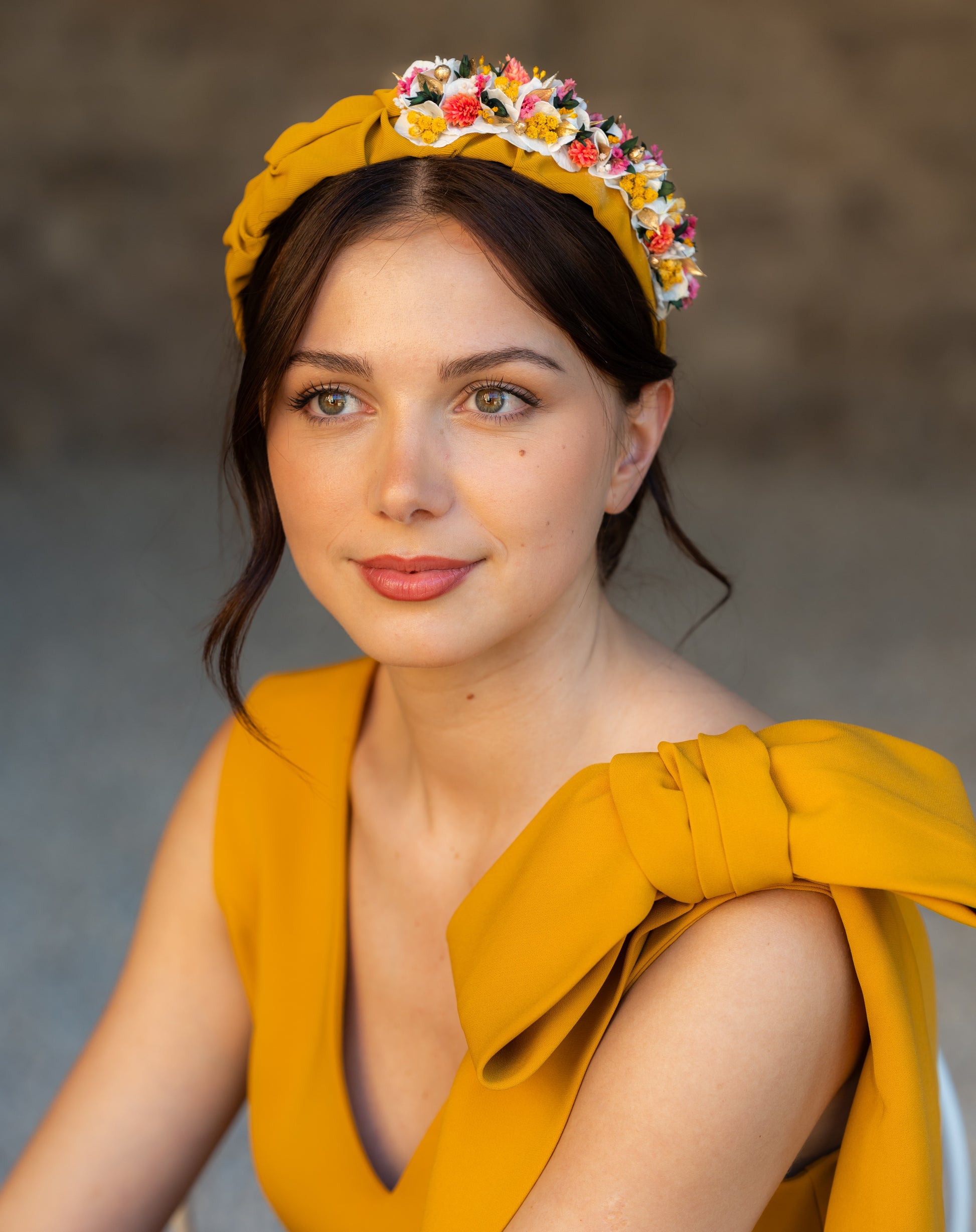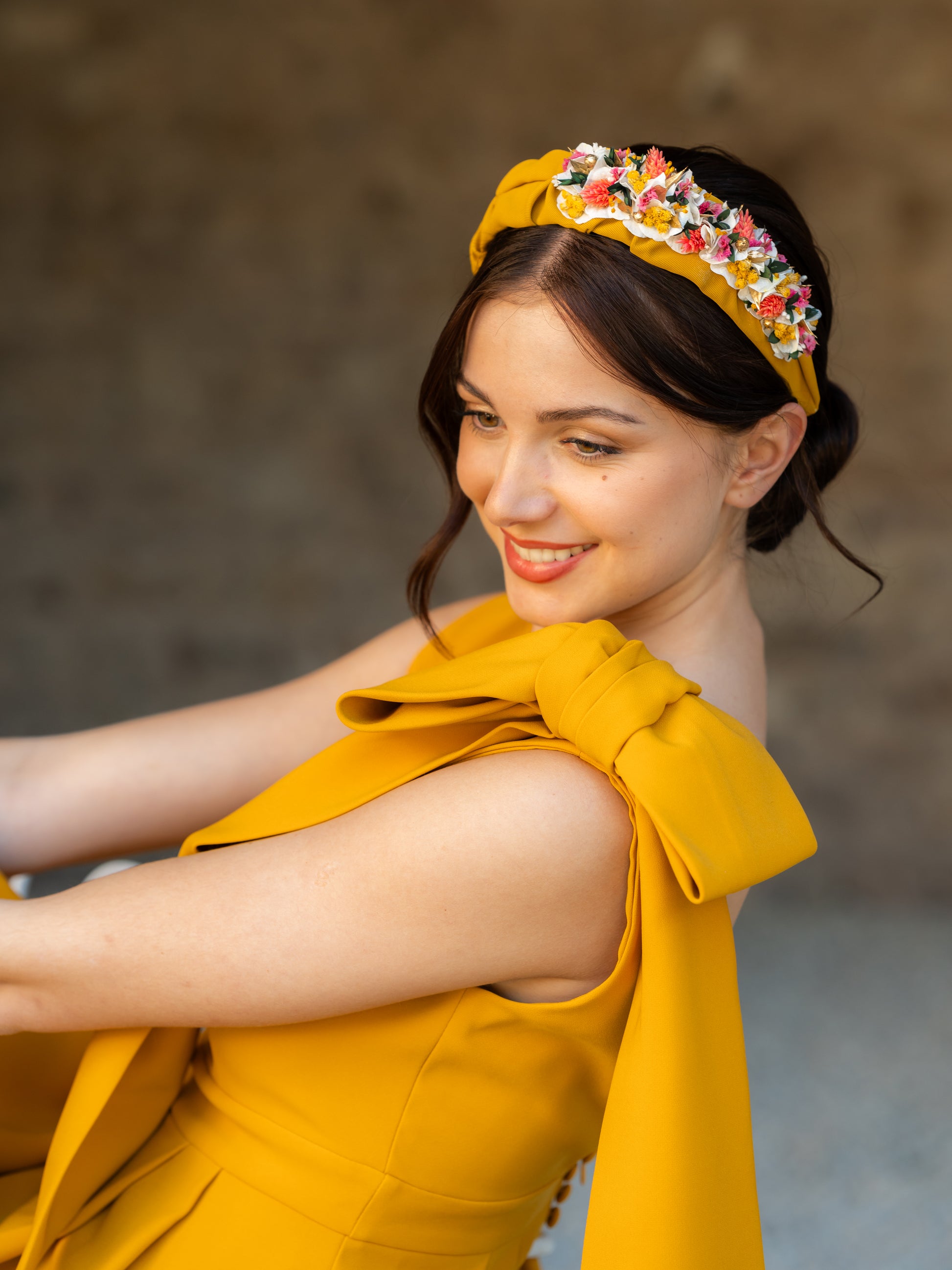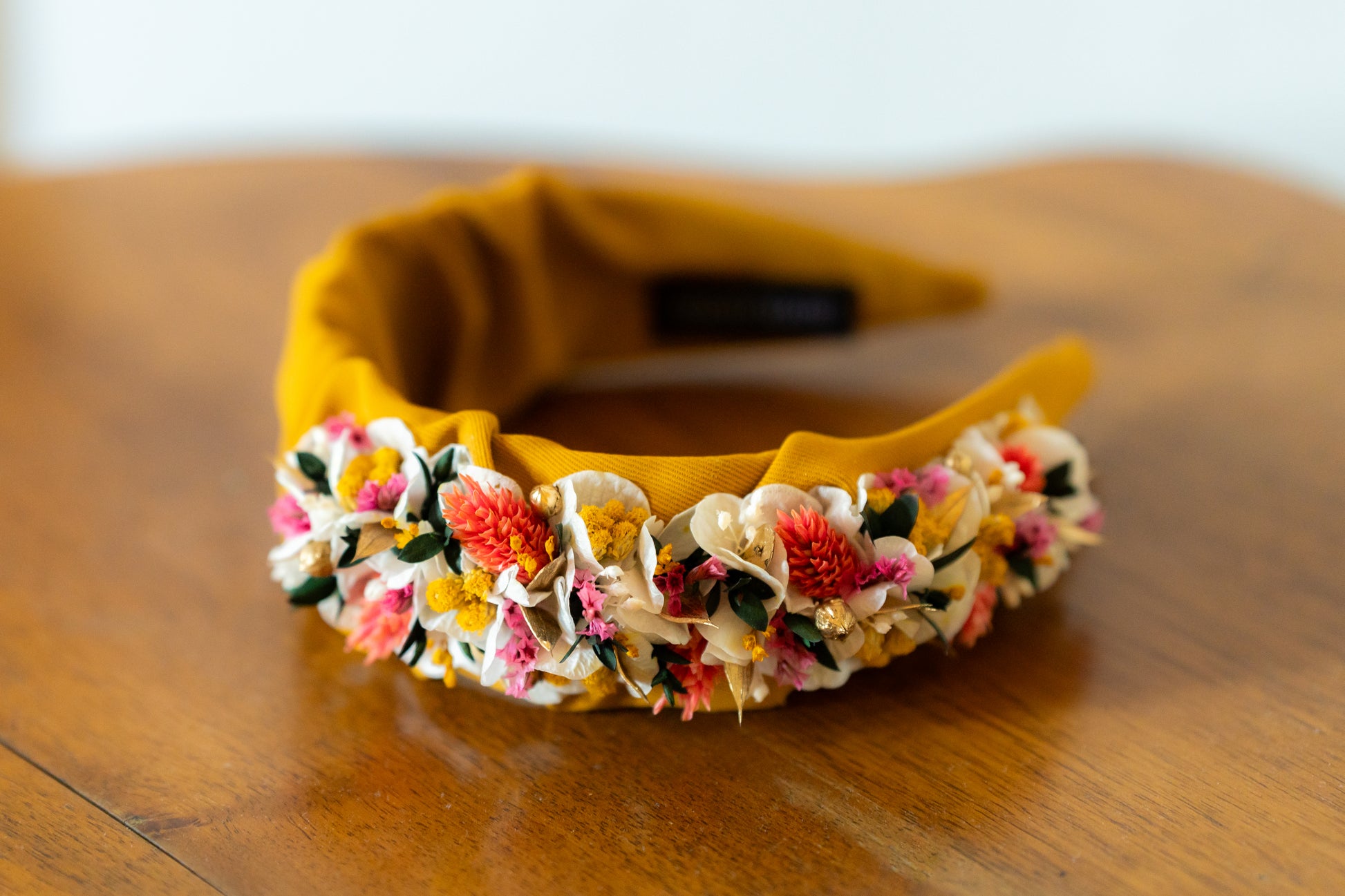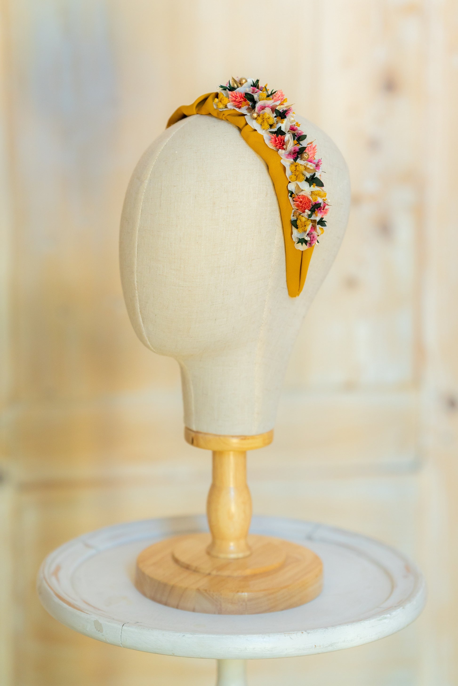 Confectionné sur une base en tissu jaune moutarde, ce serre-tête est orné de fleurs aux nuances douces — blanc, rose, doré et feuillage — pour une allure à la fois naturelle et sophistiquée
