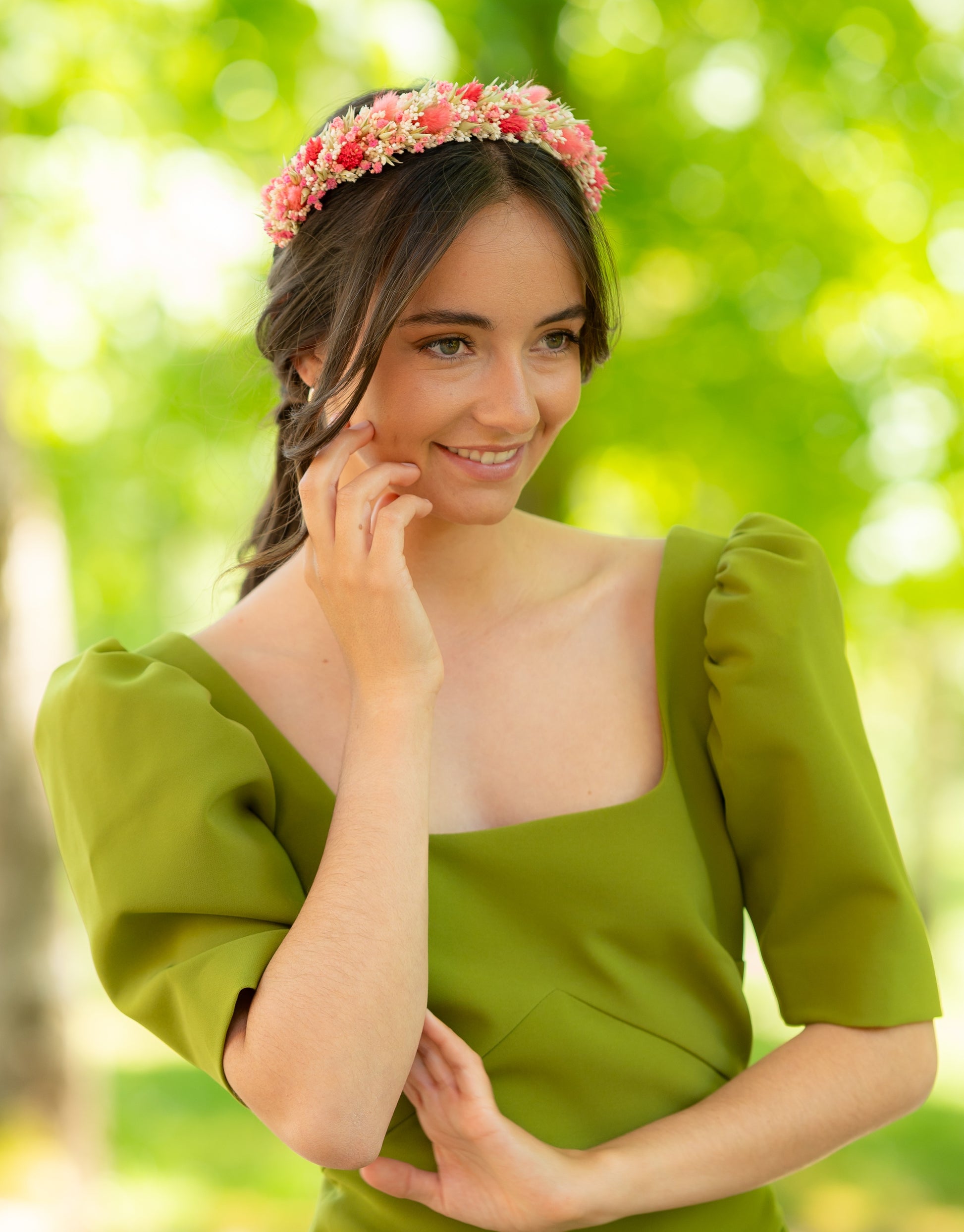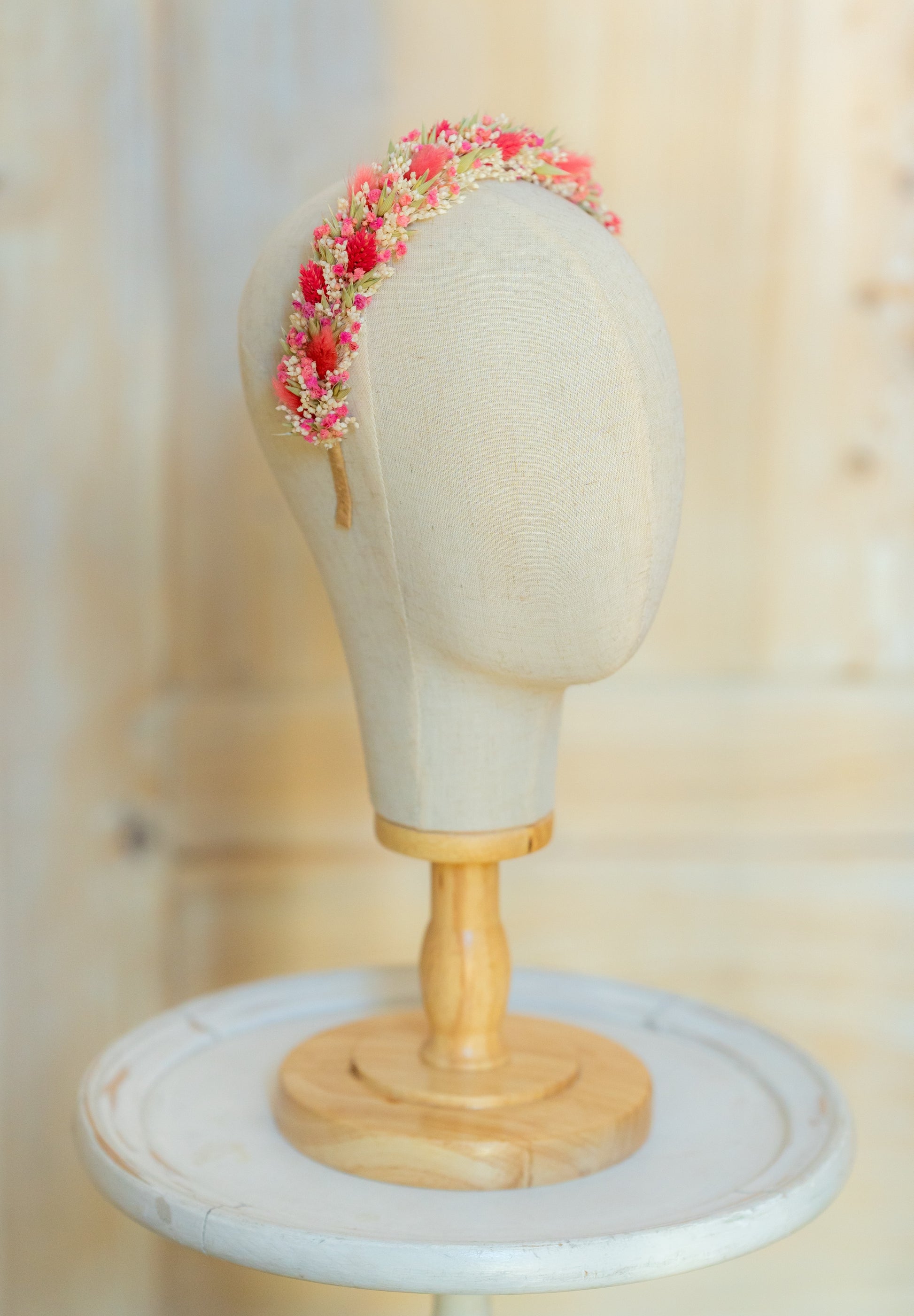 Mêlant fuchsia, rose tendre et blanc, relevé de quelques notes naturelles d’avoine, ce serre-tête apporte une touche de couleur et d’élégance.